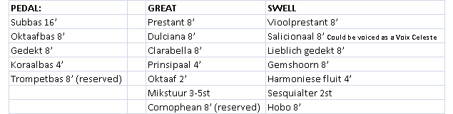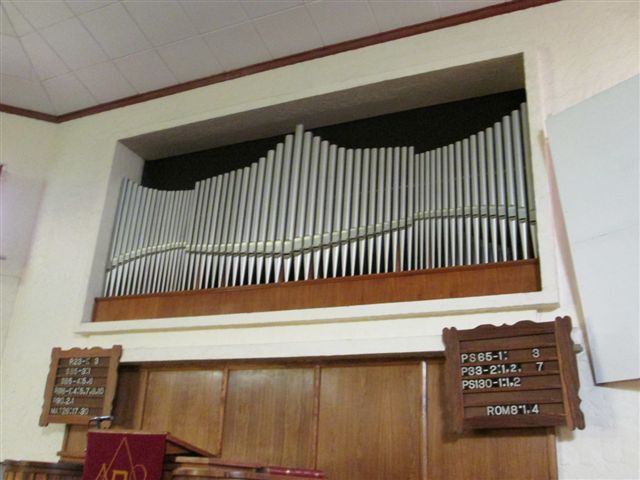 The organ was originally build by the British firm Conacher in 1894 for the Duth reformed church in Harrismith. In 1956 it was restored and enlarged by Muller organ builders when Harrismith sold it when they demolished their old church.( The Mixture and trumpet was added.) It was bought by the Reformed church in Vereeniging and was installed and revoiced by Erwin Ferhle in 1966. It was inaugerated on 13 August 1966. When the Reformed church in town center amalgated they sold the organ in order to save it from vandalism. The trumpet was removed but is reserved. It was restored by 2019 and now on the market again. It consists of the following registers.