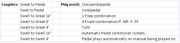 The pedal is independent and do not borrow from manuals other than the reserved trumpet. Over 1300 pipes Price R 180 000 Delivered, installed and tuned within reasonable distance from Eastern Freestate. Longer distance will incur additional costs.This price is adjustable each year.